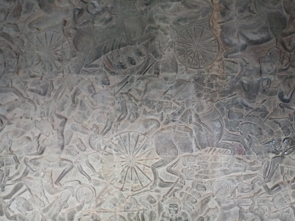 The walls of the inner sanctum adorn the stories of Ramayana and Mahabharata – the two ancient Hindu epics – alongside sculptures portraying Suryavarman II as Lord Vishnu performing his sovereign duties. In front of the central structure lies an elevated causeway with a cruciform terrace. I wander from room to room, marvelling at the bas-relief sculptures on the walls and ceilings. My guide keeps me busy with his interpretations of these murals. A Buddhist by religion, he tries to impress me with his knowledge of the Ramayana and Mahabharata.