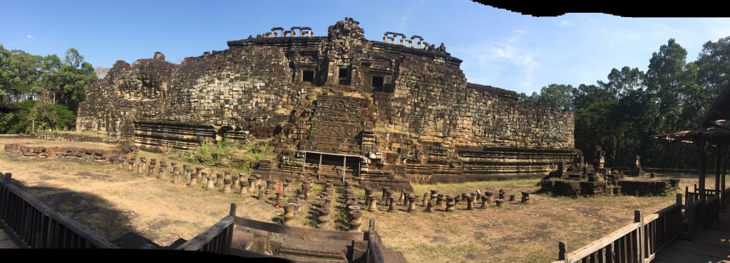 Later, when Angkor Thom came into existence under a Buddhist king, Baphuon lost its importance although it was located within the city of Angkor Thom. Walking on an elevated sandstone walkway, I can’t help imagining how impressive the pyramid-shaped (representing Mount Meru) temple might have been in its heyday. Unfortunately, since Baphuon was built on an unstable sandy soil, its structure collapsed with the passage of time. The restoration that began in 1996 and completed 16 years later has been truly remarkable. Interestingly, this temple, though spectacular, is much quieter than Bayon.