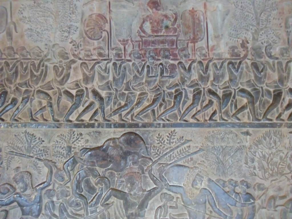 The centrally located state temple, Bayon (originally named Jaygiri meaning victory mountain), is the main attraction of Angkor Thom due to multitudes of gigantic smiling stone faces adorning the towers clustered around the central peak of the temple. The faces have a pious, compassionate look typical of any Buddha statue. Yet again I am amazed to see myriad mythological and historical scenes sculpted on the walls of the temple. Jayavarman’s naval battle against the forces of Champa king Jaya Indravarman IV on the Tonle Sap river (connects to Mekong river in South East Asia) is vividly depicted on the walls of Bayon.