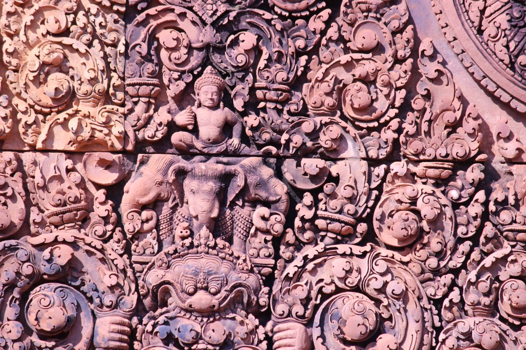 A visit to Siem Reap is incomplete without exploring the jewel of Khmer art, Banteay Srei. Located around 40 km north of Siem Reap city centre, this 10th century red sandstone temple complex is dedicated to Lord Shiva. Elaborate, intricately sculpted bas reliefs portray scenes from the Mahabharata. One particular wall carving stands out from the rest with its vivid depiction of Hindu god Indra, the king of all gods, riding his three-headed elephant, Airavat, and summoning the rain clouds to protect the burning Khandava forest.