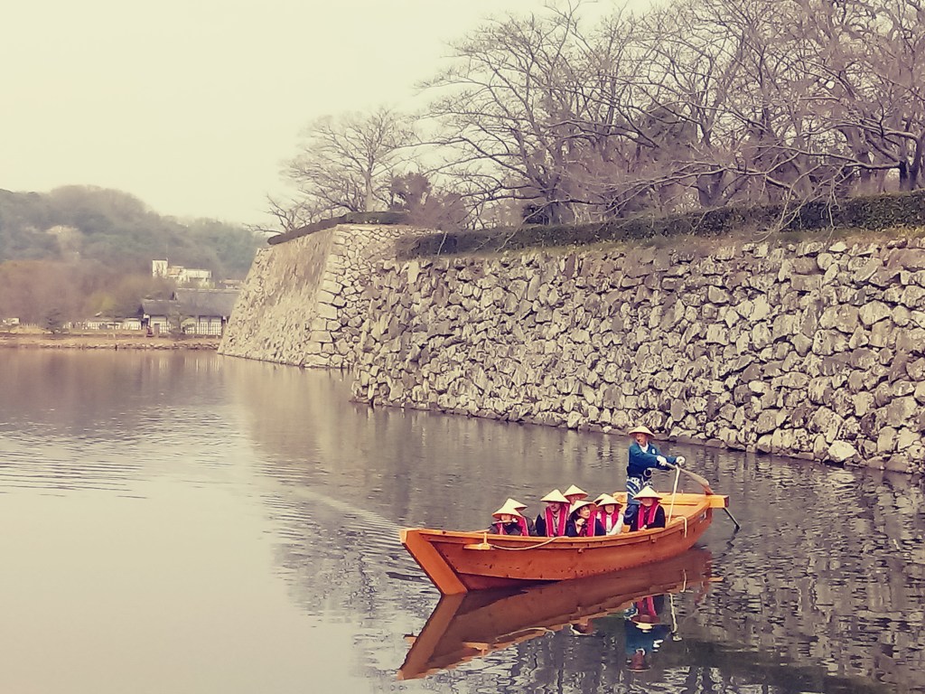 When we reached the end of the boulevard, the white, imposing structure of Himeji Castle appeared right in front of us, glistening in the morning sun. We crossed over to the other side of the street and discovered some local tourists, dressed in traditional attire, taking a boat ride on the moat surrounding the castle.