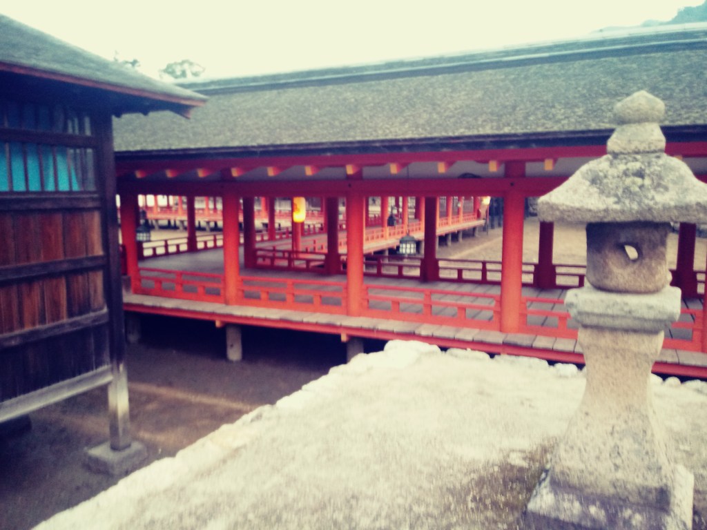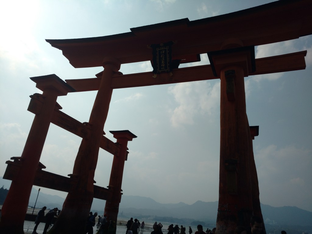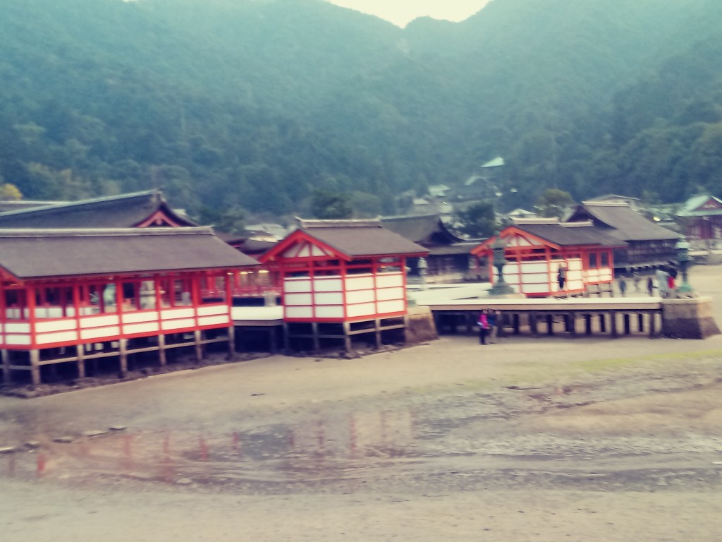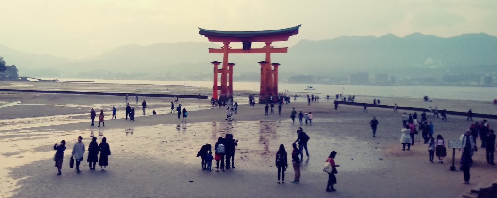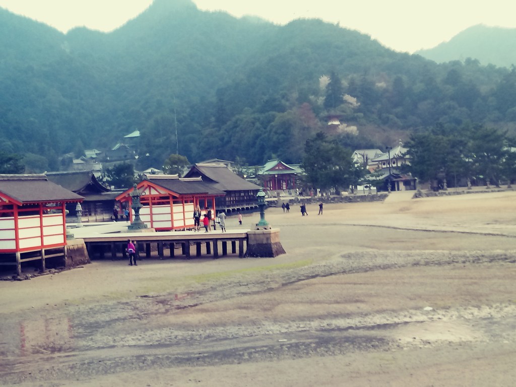 Soon after the ferry docked, we began walking briskly towards the centuries-old Itsukushima Shrine complex to take a look inside before it closed for the day at 6 pm. The complex, located in a small inlet on the bay, comprises multiple buildings – including a prayer hall, a main hall, and a Noh theatre (an old form of theater involving music, dance, and drama) – connected to each other by boardwalks. All the buildings were raised above sea level by supporting pillars that remained submerged during high tide. Unfortunately, by the time we reached the island, the water had already receded from the shrine complex, so we couldn’t enjoy the floating effect. The visit was still worth it though, as we had the entire place to ourselves 🙂 Tourists were setting up their cameras to shoot the iconic sunset from the Torii gate that had also emerged from the water due to low tide.