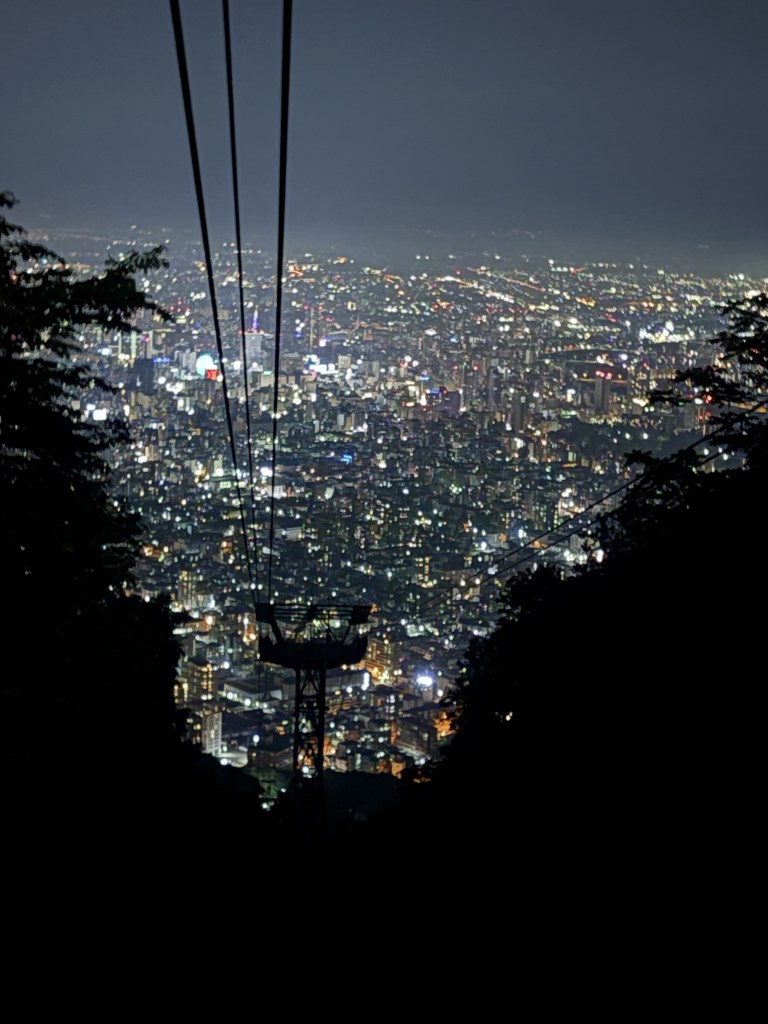 On arriving at Sapporo station, I couldn’t resist covering another popular attraction in Hokkaido – the night view from Mt. Moiwa. Exiting the station, I walked around 300 meters to the Sapporo subway station and took the subway on the Toho (blue) line to Odori. [Note: You can also reach Odori on the Namboku (green) line. Both the Toho and Namboku lines connect Sapporo to Odori.] The brightly lit Odori Park right outside the station looked quite inviting. However, due to a paucity of time, I gave it a miss. Instead, I headed to Nishiyonchome station and hopped into a streetcar that took me to Ropeway Iriguchi Station. A 10-minute walk brought me to the entrance of the Sapporo Mt Moiwa Ropeway. There was also a free shuttle bus available every 15 minutes, but I didn’t want to wait for it. At the ropeway terminal, I bought a round-trip combo ticket (1700 yen/person) that included both the ropeway and Morris car to reach the summit. During the ascent, all I could spot were the numerous city lights twinkling below.