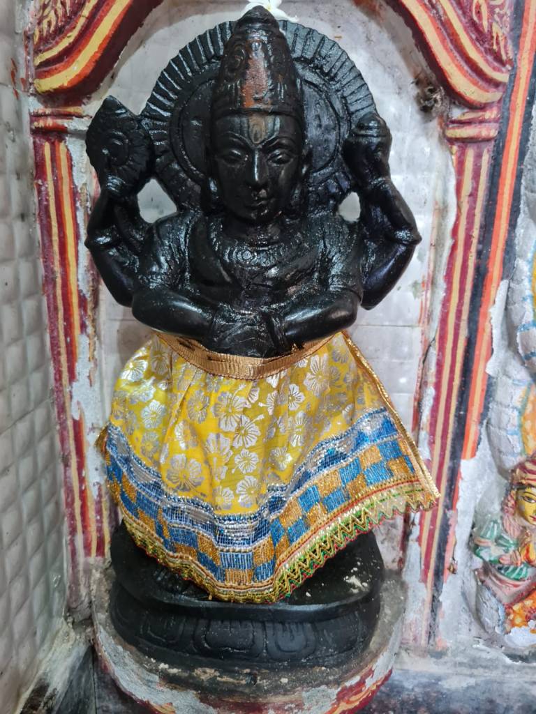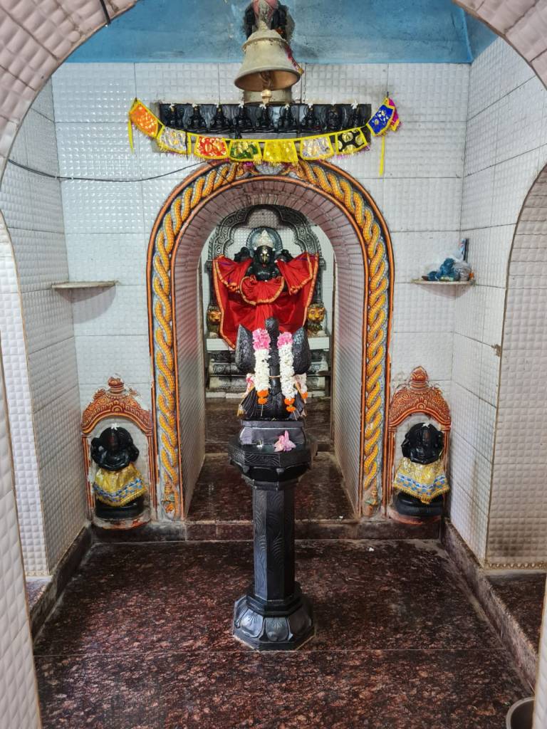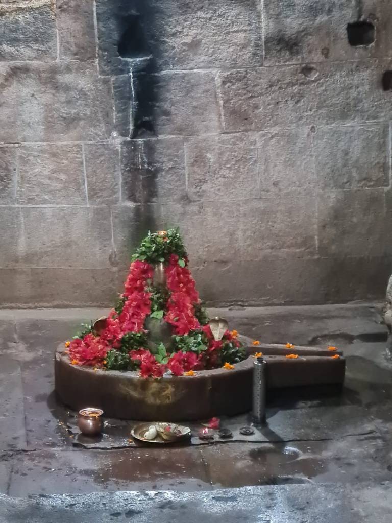 While the exterior walls have two niches holding bas-relief sculptures of the Hindu gods Ganesha and Kartikeya, inside the temple, the presiding deity is a Siva lingam.