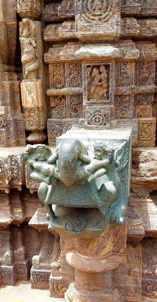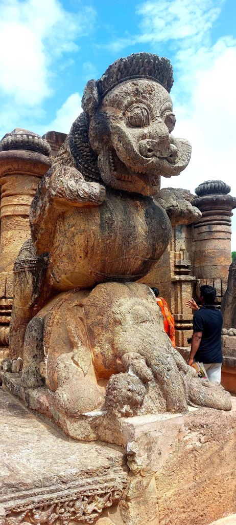 That said, let me share my experience inside this sacred complex. The first thing that struck me was how crowded the place was in the middle of the week. Along with my footwear, I had to deposit my mobile, camera, umbrella, and food items at the counter next to the West Gate, known as Vyghradwar or Tiger Gate, through which I entered the temple premises. The sun was out in its full glory. When my bare feet touched the stone floor, they got scorched immediately! As I began to take in the beautiful carvings on the walls of the ancient complex spread across 37000 square meters, the burning sensation all but disappeared. Looking up, I marveled at the magnificent 65-meter-high temple tower or gopuram. Later that day, during the flag-changing ceremony before sundown, two temple runners climbed up the tower to replace the flag or dhwaja from the summit with other flags. It looked so unreal! Hordes of resident monkeys kept running up and down the adjacent tower, known as Jagamohan or the Hall of Audience, along with the brave men who speedily climbed up and down the Garbha Mandir (Central temple) with triangular flags tied around their bodies. If there was one misstep, they would come hurtling down, hitting against the sharp edges of the tower and columns! I held my breath until the climbers were safely back on the ground. Later, I was told by a senior priest that these men, descendants of a particular family, were trained for this task since their childhood.