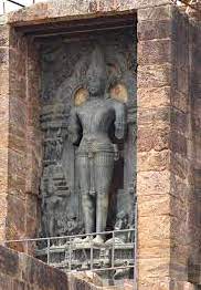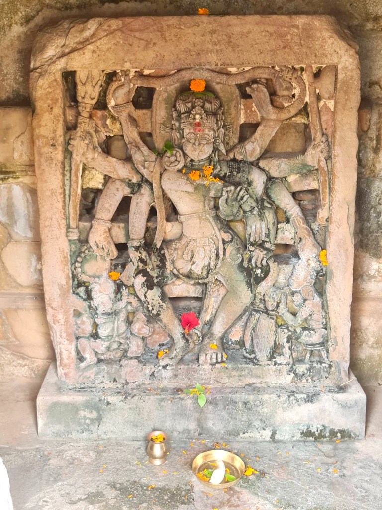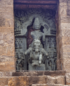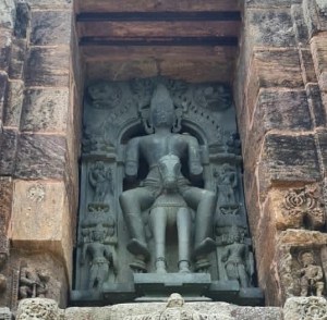 Another significant bas-relief sculpture on the front facade of the temple is that of the Dancing Nataraja with ten arms. The position of one of the right hands thrown over a left hand is one of its kind in Odisha. The face is calm and meditative.